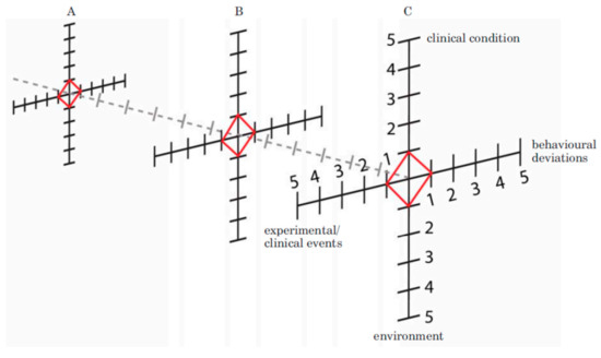 Extended Welfare Assessment Grid. Provides a volumetric assessment of animal welfare over time for a given animal. Figure represents welfare assessments performed at three different time points (A–C) spaced 6 time units apart on the time axis (dashed line). The volume resulting from connecting the three areas generated with each welfare assessment represents the cumulative severity experienced by that animal. Reprinted from [8] with permission.