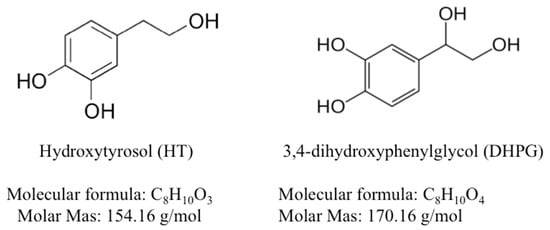 Olive fruits (Olea europea), olive oil, and its derivates present a large amount of phenolic components, for which remarkable antioxidant properties have been reported [], with corroborated advantages for human health []. Two of the most important phenolic compounds present in olive fruit are hydroxytyrosol (3,4 dyhydroxyphenylethanol, HT) and 3,4-dihydroxyphenylglycol (DHPG), which are isolated from the alperujo olive pulp (semi-solid waste generated in the two-phase system used in olive oil extraction). HT is a simple phenol with significant antioxidant properties [], which reduces the oxidation of low-density lipoproteins, protect against H2O2 cytotoxicity and minimize lactate dehydrogenase activity [,,]. Regarding DHPG, powerful antioxidant and potential anti-inflammatory effects have been reported which even compare to those reported for vitamin E [].