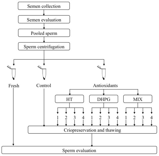 After collection, ejaculates were diluted at 1:2 with TRIS-based extender (FA of Biladyl without egg yolk) for individual evaluation and, if inclusion criteria were reached, these were pooled and diluted to reach a dilution of 1:10. To remove seminal plasma, pooled samples were centrifuged at 600× g for 15 min. The supernatant was removed and the pellet was resuspended, adding a volume of fraction A of Biladyl containing egg yolk (FAey). Then, the pooled sample was split into 13 different aliquots; 12 samples were prepared by adding FAey supplemented with the previously described HT, DHPG and MIX antioxidant concentrations. A control group (no antioxidant) was also prepared. The samples were then immediately placed in a programmable freezer (cell incubator SH-020S, Welson, Korea) to reach 5 °C and maintained for two hours at 5 °C.