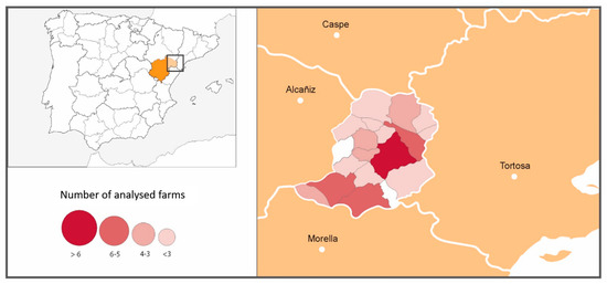 Number of farms sampled by municipalities within the Matarraña region.