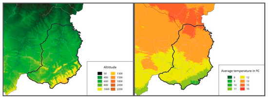 Maps of the Matarraña region, where the altitude (left) and average temperature in °C (right) are shown (http://www.opengis.uab.es/wms/aragon/. Access 15 May 2021).