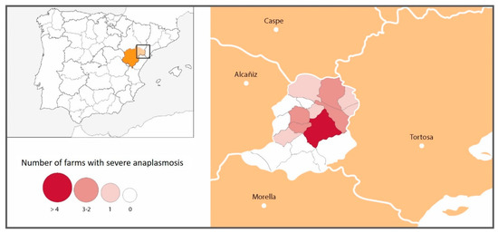 A classification of the farms in three levels was performed according to the epidemiological survey, focused on the presence/absence of animals with compatible clinical signs and the use of antibiotics to treat them. Farms of type I were those without anaplasmosis-compatible clinical signs. Farms of type II had animals with compatible clinical signs, but no antibiotics had been administered. Finally, farms of type III had animals with compatible clinical signs that had been treated with antibiotics. In Figure 1, the number of farms sampled by municipalities within the Matarraña region is shown.