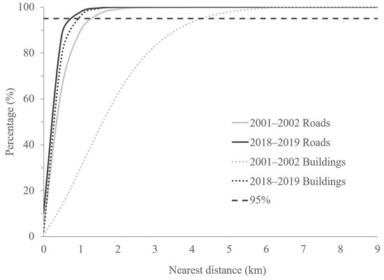 Compared to 2001–2002, a higher density of roads and buildings was found in 2018–2019. In 2001–2002, ninety-five percent of all lands were located within 1.28 km of the nearest road and within 4.27 km of the nearest building; in 2018–2019, these distances decreased to 0.96 km and 0.75 km, respectively.