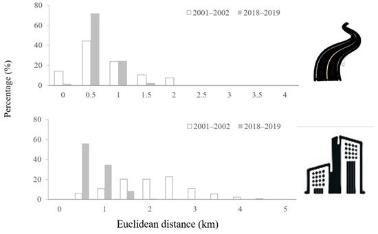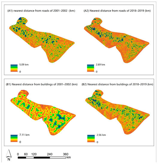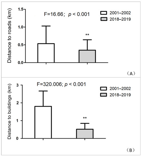 Within the Dabie Mountains, all lands were located within 10 km of a road or a building (Figure 2). The nearest road (t = 64.009, df = 6420.63, p < 0.001) and building (t = 140.677, df = 6620.57, p < 0.001) were closer on average in 2018–2019 than in 2001–2002. The maximum distance to the nearest road decreased from 5.09 km in 2001–2002 to 2.69 km in 2018–2019, while the maximum distance to the nearest building decreased from 7.11 km in 2001–2002 to 2.56 km in 2018–2019 (Figure 3). Ninety-five percent of all lands were located within 5 km of the nearest road or building (Figure 2).