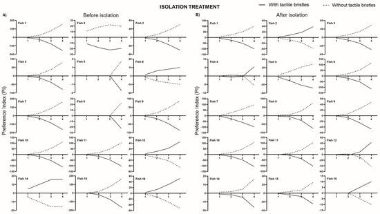 The preference index showed a consistent individual choice, following the tendency of the former analysis. In the isolation treatment, only four out of 15 fish preferred to cross by the area with bristles both before (Figure 5A) and after (Figure 5B) isolation, although the preference changed for two of them. In the social stress treatment, four out of 14 fish preferred to access the area with bristles before social stress (Figure 5C), but only one individual kept the preference for tactile stimulation after social stress (Figure 5D).