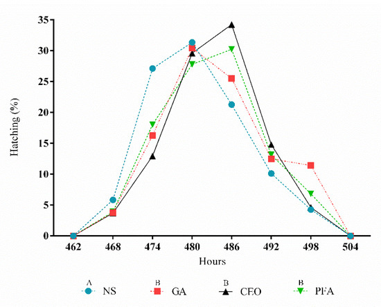 Figure 1. Hatching curves for different sanitization treatments. NS, nonsanitized; GA, grain alcohol; CEO, clove essential oil; PFA, paraformaldehyde. A,B Curves with different letters differ significantly (p < 0.05).