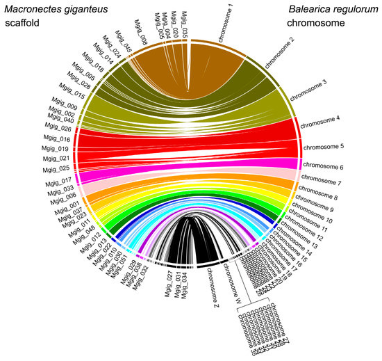 Collinear relationship between Macronectes giganteus and Balearica regulorum. Lines between the two rectangles show the shared syntenic blocks between the chromosomes, based on sequence homology.