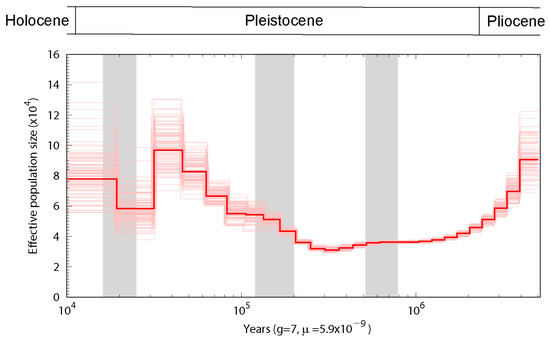PSMC analysis [33] based on a hidden Markov model has been used to estimate the history of effective population size (Ne) based on genome-wide heterozygous sequence data, and in the present study, analysis using the PSMC model revealed evidence of population expansion from 200 to 300 thousand years ago, followed by a subsequent contraction in size (Figure 3).