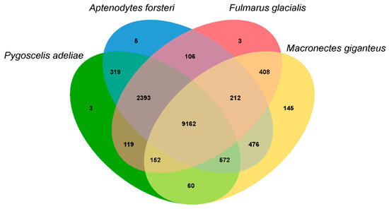 A Venn diagram of the paralogous and orthologous groups among the Adélie penguin (Pygoscelis adeliae), emperor penguin (Aptenodytes forsteri), northern fulmar (Fulmarus glacialis), and southern giant petrel (Macronectes giganteus) obtained using OrthoFinder.