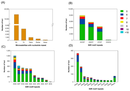 The distribution and frequency of microsatellite motifs. (A) Frequency of different microsatellite repeat types. (B–D) Frequency of different dinucleotide, trinucleotide, and tetranucleotide microsatellite motifs, respectively. The colors for (B–D) indicate the frequency of microsatellite mofits.