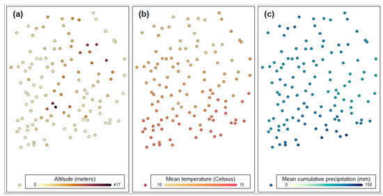 Dispersion of the Hanwoo farms in South Korea with a summary about the locations’ (a) altitude (1–147 m), (b) average temperature (10.0–15.3 °C), and (c) average cumulative precipitation (83.2–138.3 mm). Average temperature and precipitation are historical means on measurements between the years 2000 and 2019 [26,27].