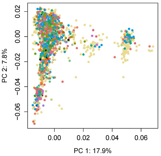 Principal components analysis of the population based on the genomic relationship matrix (). The different colors indicate the 124 farms on which each individual was located.