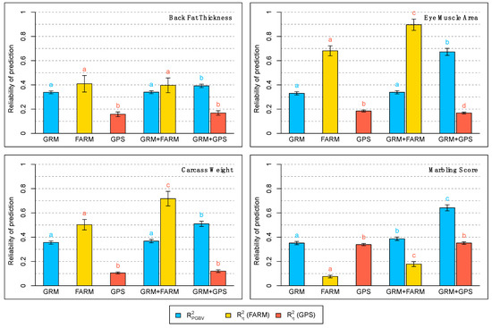 Reliability of predicted genomic breeding values (), and reliability of predicted herd effects (), for all four traits and all the five models considered. The heights of the barplots in this figure represent the mean over 100 replicates of each model, with their confidence intervals indicated. Letters a, b, c, d indicate the groups obtained with Tukey’s multiple comparison test at a significance level of 0.05, comparing the values of (blue letters) and of (red letters) obtained with the different models, within each trait.
