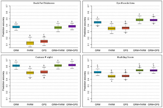 Accuracy of phenotypic prediction (), for all four traits and all the five models considered. Boxplots based on 100 cross validation replicates of each model. The predicted phenotypes were for the GRM model, for the FARM and the GPS models, and for the GRM + FARM and GRM + GPS models. Letters A, B, C, D indicate the groups obtained with Tukey’s multiple comparison test at a significance level of 0.05, comparing the values of obtained with the different models, within each trait.