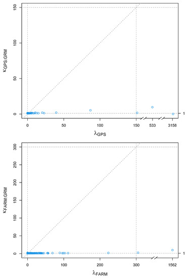 To rule out any potential confounding effects between and , and between and , we compared their variance structures using the kappa statistics () plotted against the eigen-values () of and , as proposed by [5]. If and are very aligned, there is confounding between the matrices. If , there is no confounding between the matrices [35]. Each element of was computed as for every ( being the number of observations), where and are the and eigen-vectors of (FARM or GPS) and respectively, and is the eigen-value of .