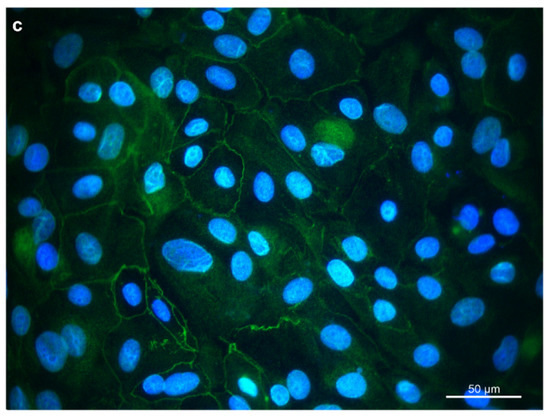 For further characterization, immunocytochemistry was employed. Cytokeratins were expressed in the cytoplasm of the REC (Figure 2a). Vimentin was expressed, forming a filamentous network throughout the cytoplasm. (Figure 2b). Furthermore, REC also expressed the tight junction protein occludin at the cells’ border (Figure 2c). Unspecific background staining in the cytoplasm was seen with occludin as well.