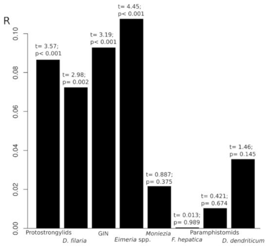 In general, prevalences for the different parasites were higher in mixed than in pure sheep flocks. Chi-squared test indicated that goat contact was a risk factor for sheep to be infected by protostrongylid nematodes, D. filaria, GIN and Eimeria spp. (p < 0.001) in all cases. For those infections, prevalence was from 1.61 to 1.99 times higher in sheep from mixed flocks than in ovine in pure flocks. On the other hand, prevalences for Moniezia, F. hepatica, D. dendriticum and Paramphistomidae were not influenced by goat contact. Multivariate analysis showed the same associations indicated by univariate Chi-squared test; correlations obtained with the plspf() function between infection variables and the sheep–goat contact are displayed in Figure 2. In order of relationship, the most affected infection was coccidia, followed by GIN, protostrongylid and D. filaria infection, among the significantly related ones. Although significant, R values were low, infections were also correlated among them, mainly with GIN and D. filaria (data not shown), and the effect of mixed management is only one of the risk variables for the sheep infections.