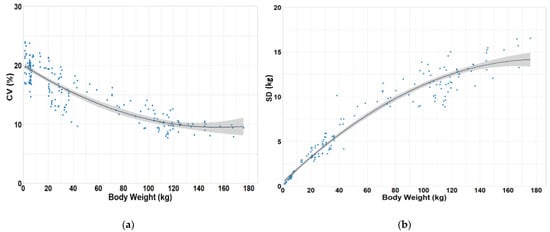Plots of coefficient of variation (CV) and standard deviation (SD) as a function of body weight (BW) from birth to market. Gray area represents the 95% confidence interval on CV and SD of BW, respectively. (a) Relationship between CV and BW (CV = 20.04 − 0.135 BW + 0.00043 BW2; standard error of regression coefficients, 0.253, 0.0112, 0.000078, respectively; R2 = 0.79, all terms p < 0.05). (b) Relationship between SD and BW (SD = 0.41 + 0.150 BW − 0.00041 BW2; standard error of regression coefficients, 0.133, 0.0059, 0.000041, respectively; R2 = 0.95, all terms p < 0.05).