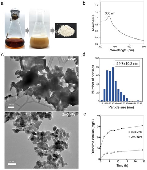 (a) Reduction of Zn2+ to ZnO NPs using L. plantarum TA4. (b) UV-Visual spectroscopy of biosynthesized ZnO NPs. (c) HR-TEM micrographs of bulk ZnO and biosynthesized ZnO NPs. (d) The size distribution of ZnO NPs (based on HR-TEM image). (e) Dissolution of Zn2+ from bulk ZnO and ZnO NPs in 0.85% NaCl suspension over incubation time assessed by ICP-OES. The concentration of Zn used in this study was 100 mg/L.