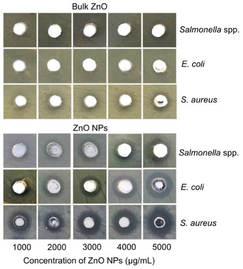 Agar well diffusion method was used to investigate the antibacterial activity of biosynthesized ZnO NPs against poultry-associated foodborne pathogens following the procedure outlined in our previous study [26]. Briefly, the bacterial strains were grown until they reached the 0.5 McFarland turbidity standards and a lawn of bacterial strain was made by spreading them uniformly onto a nutrient agar (NA) (Merck, Darmstadt, Germany) plate using a sterile cotton swab. A sterile cork borer of 6 mm in diameter was used to make the wells, and about 100 µL of ZnO NPs (at concentrations of 1000, 2000, 3000, 4000, and 5000 µg/mL) were filled into respective wells. The agar plates were incubated for 24 h at 37 °C, and the diameter (mm) of inhibitory activity shown by a clear zone around each well was measured with a ruler. Bulk ZnO served as a negative control. The experiments were carried out in triplicate.