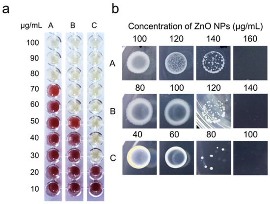 (a) Minimum inhibitory concentration (MIC) and (b) minimum bactericidal concentration (MBC) of biosynthesized ZnO NPs against (A) Salmonella spp., (B) E. coli, and (C) S. aureus.