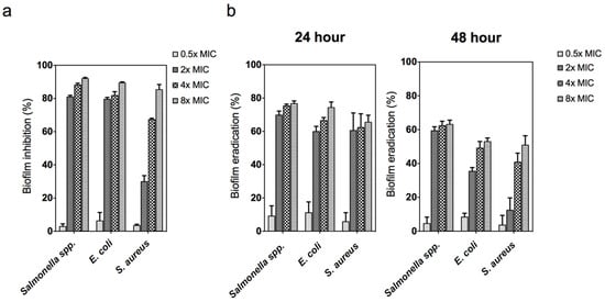 (a) Biofilm inhibitory following treatment with ZnO NPs 0.5×, 2×, 4×, and 8× minimum inhibitory concentration (MIC) against Salmonella spp., E. coli, and S. aureus. (b) Biofilm eradication at 24 h and 48 h following treatment with ZnO NPs 0.5×, 2×, 4×, and 8× MIC against Salmonella spp., E. coli, and S. aureus. Biofilm was assessed by crystal violet staining and measured at an absorbance of 590 nm. The data represent the mean ± SD of three replicates.