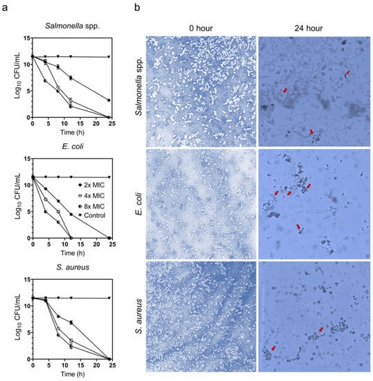 (a) Time–kill assay based on cell viability (log10 CFU/mL) on the poultry-associated foodborne pathogens, Salmonella spp., E. coli, and S. aureus at the concentrations of 2×, 4×, and 8× MIC at different time intervals (0, 4, 8, 12, and 24 h). Bars represent the standard deviation of the mean for three replicates. (b) Trypan blue dye exclusion assay of Salmonella spp., E. coli, and S. aureus at 0 h and 24 h treated with ZnO NPs at the concentrations of 8× MIC. Dead cells are indicated with red arrows. The 0 h selection were used as a control of live cells. The images were taken using a light microscope at 100× magnification.