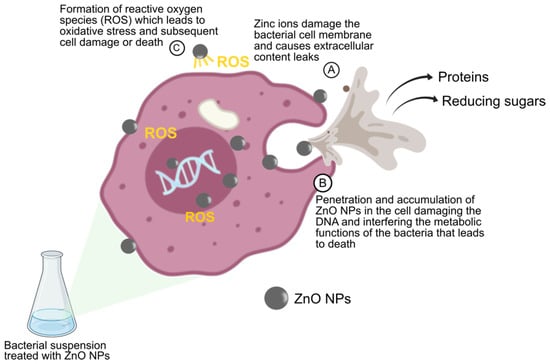 The production of ROS was assessed in all the bacteria by treating them with ZnO NPs. Bacterial cells produce excessive ROS, including superoxide radical, when the ambient environment is unconducive, which means more enzymes and antioxidants need to be produced to scavenge the ROS [55]. However, the accumulation of ROS results in oxidative stress-induced cell death. Various antibacterial mechanisms of NPs have been proposed [6,38] (Figure 6), with the production of ROS being the most commonly proposed antibacterial mechanism. Metal and metal oxide NPs are well documented in their ability kill microorganisms through the generation of ROS. The chain of events leading to cell death following the production of ROS from ZnO NPs includes cell membrane disruption, attenuation of DNA replication, and dysfunctional production of adenosine triphosphate (ATP), leading to impaired bacterial metabolism [56].