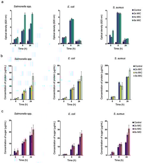 (a) Reactivity oxygen species (ROS) quantification. Cellular leakage analysis of (b) protein content and (c) reducing sugar from the cell suspensions of Salmonella spp., E. coli, and S. aureus bacteria treated with different concentrations of ZnO NPs at 0, 8, and 24 h of incubation time. Data were shown as the mean ± SD of three replicates.