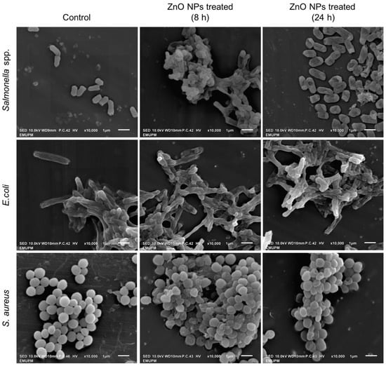 Visualization of zinc oxide nanoparticles (ZnO NPs) treated Salmonella spp., E. coli, and S. aureus at 8 and 24 h using a scanning electron microscope (SEM). The absence of ZnO NPs was used as control.
