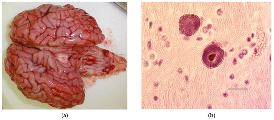 (a) (left) Grossly normal brain from a calf that died in the perinatal period with Neospora caninum cysts in its brain. (b) (right) Neospora caninum cysts in the brain of a calf that died in the perinatal period. Bar 20 µm.