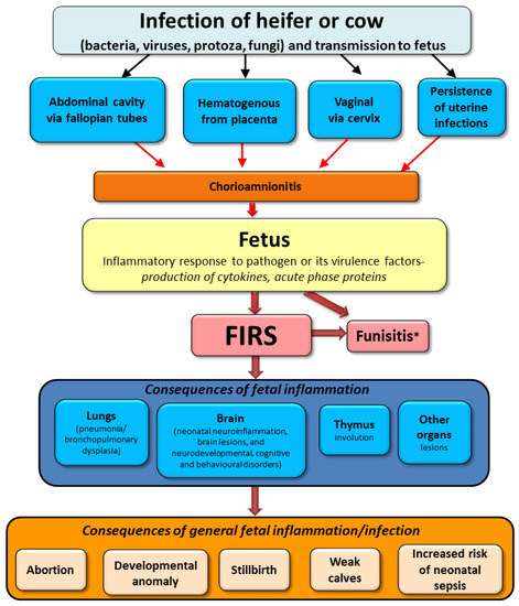 In conclusion of above-described results from human and animal medicine, the possible course of infection in utero on fetal calf fate is presented in Figure 3.