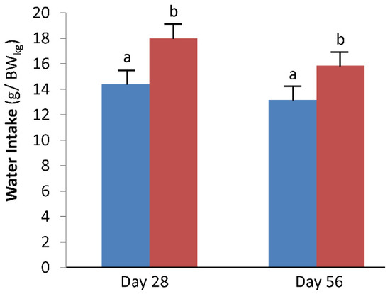 Water intake (g/BWkg per day) after 28 and 56 days of treatment. Cats consumed either control water (deionized; blue; n = 6) or 1% methylcellulose water (viscous; red; n = 6) for 56 days and were then switched to the other water type for 56 days. Shown are least-square means ± pooled standard errors of means for all cats (n = 12) while consuming the control or viscous water type. a,b Means with different superscripts within a period are different. Water intake was significantly greater in both groups of cats at day 28 compared with day 56.