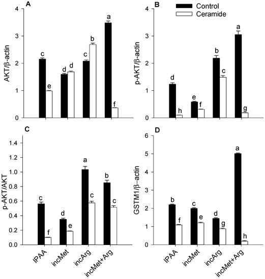 Protein abundance (relative to β-actin) of AKT (total, panel A), p-AKT (active, panel B), ratio of p-AKT/AKT (panel C), and GSTM1 (panel D) in subcutaneous adipose tissue cultured with different levels of Met or Arg and stimulated with ceramide. Control media contained an ideal AA profile (IPAA) with ratios of Lys:Met 2.9:1 and Lys:Arg 2:1. Treatment media was supplemented with greater amounts of Met or Arg to achieve ratios of Lys:Met 2.5:1 and Lys:Arg 2:1 (incMet), Lys:Met 2.9:1 and Lys:Arg 1:1 (incArg), or Lys:Met 2.5:1 and Lys:Arg 1:1 (incMet + Arg). Different letters indicate differences between treatments (Met × Arg × Ceramide p < 0.05). AKT = protein kinase B; GSTM1 = glutathione S-transferase Mu 1. Data are LS means, n = 4 cows per group, ±pooled SEMs.