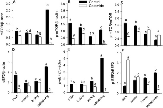 Ceramide stimulation downregulated overall abundance of p-AKT, p-mTOR and p-eEF2 (p < 0.01; p < 0.01; p < 0.01; Table 2). There was a Met × Arg × Ceramide interaction for p-AKT, p-mTOR and p-eEF2 (p < 0.01; p < 0.01; p < 0.01; Figure 1B and Figure 2B,E). Without ceramide challenge, enhanced supply of Met and Arg alone or in combination led to lower p-mTOR (p < 0.01; p < 0.01; p < 0.01; Figure 2B). However, compared with the control (IPAA) cultures challenged with ceramide, enhanced Met or Arg supply alone or in combination resulted in greater activation of AKT (p-AKT/total AKT) and mTOR (p-mTOR/total mTOR) (p < 0.01; p < 0.01; Figure 1C and Figure 2C), with a more pronounced response due to Arg (p < 0.01; Figure 1C and Figure 2C). In contrast, compared with IPAA challenged with ceramide, enhanced Met or Arg supply alone or in combination led to lower activation of eEF2 (p-eEF2/total eEF2) (p < 0.01; p < 0.01; p < 0.01; Figure 2F). Ceramide stimulation downregulated overall abundance of GSTM1 (p < 0.01; Table 2). A Met × Arg × Ceramide interaction was observed for GSTM1 (p < 0.01; Figure 1D). It is noteworthy that greater Met supply alone during ceramide challenge led to the greatest abundance of GSTM1 (p < 0.01; Figure 1D).