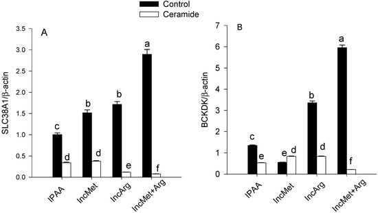 A triple interaction between Met, Arg and ceramide was observed for the protein abundance of SLC38A1 and BCKDK (p < 0.01; p < 0.01; Figure 3). Ceramide stimulation reduced overall protein abundance of SLC38A1 and BCKDK (p < 0.01; p < 0.01; Table 2). With ceramide stimulation, compared with IPAA, greater supply of Met or Arg alone attenuated the downregulation of BCKDK (p < 0.01; p < 0.01; Figure 3B).