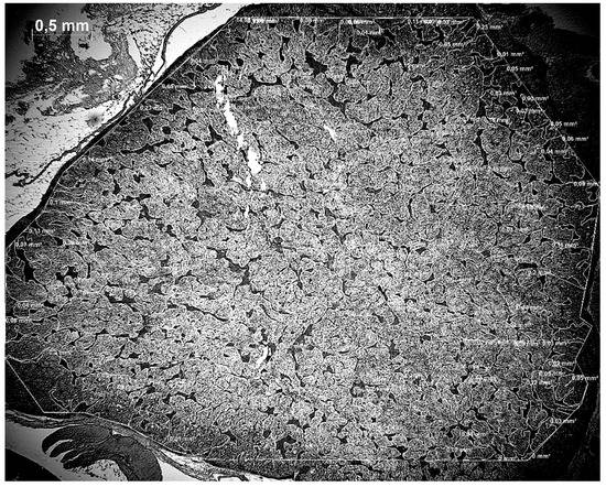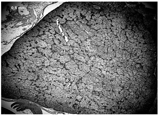 For microscopical analysis, five sections of each adrenal gland (Figure 1) were examined under a microscope (Stemi 305, Zeiss, Jena, Germany) and photographed (Axiocam 506 mono, Zeiss, Jena, Germany) with an amplification of 25 fold (N = 130). The evaluation of the size area was made using the ZEN software (ZEN 2.1 black; Version 11.0.0.190; ZEISS; Jena, Germany). As a first step, the total area was defined and artifacts, blood vessels and unidentifiable tissue were excluded. Then, the area of interrenal cell parts was circled and the given interrenal area was subtracted from the total area to determine the adrenal cell parts (Figure 2).