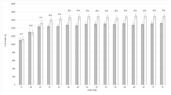 Development of body weight during the whole study (n = 7 laying hens in single cages, grey bars; n = 6 laying hens in floor pens, white bars). Figure shows means of least squares plus/minus standard error. Lowercase letters indicate significant differences (p < 0.05).