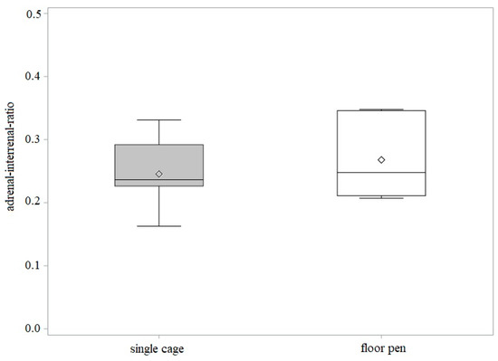 Adrenal–interrenal ratio in single cages (n = 7 laying hens, grey box) and in floor pen (n = 6 laying hens, white box). The vertical boxes show the range between the 25th and 75th percentiles with whiskers extending to 2.5 of the interquartile range. The horizontal line indicates the median; diamond indicates the mean.