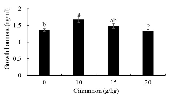 Blood growth hormone levels of European sea bass fed dietary cinnamon. Bars with different letters are significantly different (p < 0.05).