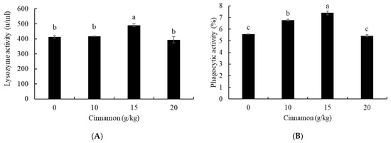 Blood lysozyme (A) and phagocytic (B) activities of European sea bass fed dietary cinnamon. Bars with different letters are significantly different (p < 0.05).