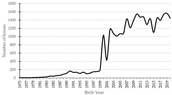 The number of horses registered in the CPH Studbook by birth year.