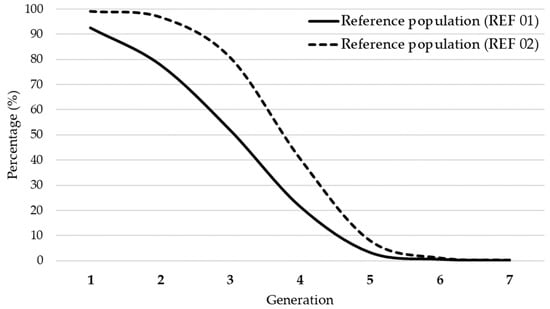 The REF 02 had a completeness value for the first two generations (99.04% and 96.66%), while in the third generation the completeness dropped to 80.76% compared to the REF 01 population (92.59%, 77.92%, and 51.96%). Beyond the seventh parenteral generation the completeness was close to zero.