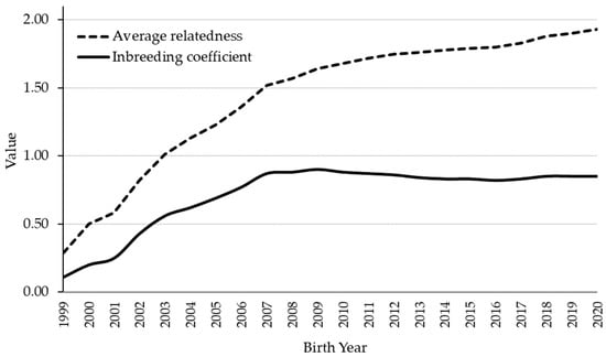 The average inbreeding (F) in the total population was 0.85%, ranging from a minimum of 0.11% (1999, beginning of breed consolidation and a larger number of founders) to a maximum of 0.90% (2009) (Table 1). In the last decade, the average inbreeding range was from 0.82 to 0.87, indicating a stabilization of the population and a very good implementation of the breeding program (Figure 3). The mean average relatedness (AR) coefficient in the whole population was 1.08%. The effective population size calculated via individual increase in inbreeding is 170.89 and via regression on equivalent generations is 240.12.