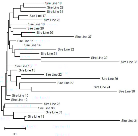 To gain more insight into the relationships within lines from the 29 sire-lines, we left in the analysis those that were represented by five or more genotyped individuals. Thus, of the 29 sire-lines, 13 remained, with a total of 252 individuals (range per line was from 5 to 57). Genetic differentiation among the 13 most representative sire-lines was negligible, with an average FST value of 0.02. The high number of migrants (Nm) of 12.4 influenced such a low differentiation. In addition, the low genetic variation due to inter-line differences (2%) is in agreement with the above, while differences within individuals accounted for the remaining 98% of the variation. The overall pairwise relatedness was low (−0.008) among the 252 individuals from the 13 sire-lines. This indicates that members were either unrelated or very distantly related. Pairwise relatedness values above 0.50 (expected of a parent/full sibling) were detected once, values from 0.25 to 0.50 (grandparent level/half-sibling) were rare (0.25%), and pairwise relatedness with values below 0.25 was in the majority of cases (99.75%).