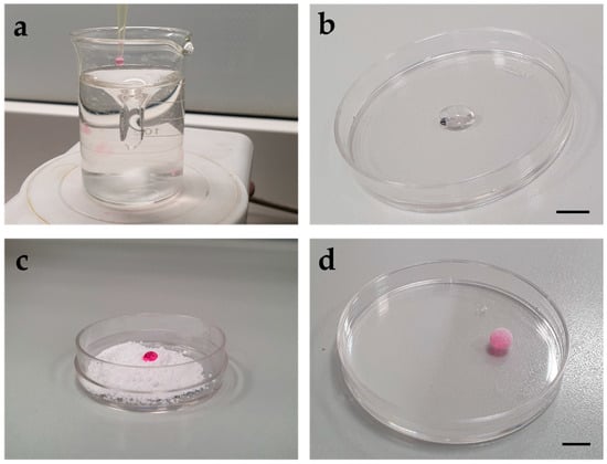 Macroscopic appearance of three-dimensional (3D) culture systems suitable for cat oocyte and embryo culture. (a,b) Preparation and final appearance, respectively, of 3D barium alginate microcapsules obtained by dropping of 10 µL drops of base culture medium with BaCl2 (40 mM) into stirring sodium alginate (0.5%). Black bar: 5 mm. (c,d) Preparation and final appearance, respectively, of 3D liquid marble microbioreactors obtained by dropping and rolling of 30 µL medium microdrops containing the oocytes onto polytetrafluoroethylene (PTFE) powder. Black bar: 5 mm.