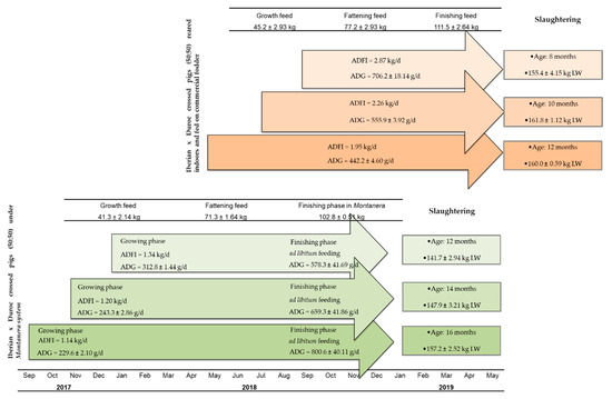 In the intensive system, the ages at slaughter for the various animal batches were 8, 10 and 12 months old. In terms of the production system conditions, animals were reared in an intensive system, with a minimum living space of 2 m2 per animal. The animals that were slaughtered at 10 and 12 months of age were subjected to feeding restrictions, and their daily feed was provided individually by placing each pig in an individual pen, whilst the animals to be slaughtered at 8 months old were fed ad libitum. Therefore, the ADFI, according to the animal batches, were 2.87, 2.26 and 1.95 kg/day for IB × D animals slaughtered at 8, 10 and 12 months. This allowed for slaughter of the animals to take place simultaneously while they had similar live weights (155.4 ± 4.15, 161.8 ± 1.12 and 160.0 ± 0.59, respectively) (Figure 1). The nutritional characteristics of the commercial feeds supplied according to the animal live weights are shown in Table 1.
