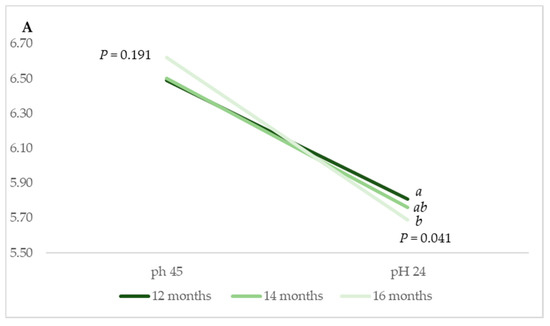 Some differences were identified in terms of pH24 (p = 0.041) between muscles from animals reared in Montanera on account of the animal age at slaughter (Figure 2A). Muscles from animals that were slaughtered at 12 months of age yielded the highest value, i.e., 5.81, in comparison to 5.76 and 5.69 for LT muscles from animals slaughtered at 14 and 16 months of age, respectively. Additionally, the declining pH rate was more pronounced in LT muscles from animals slaughtered at 16 months of age compared to those of muscles from animals slaughtered at 12 and 14 months old.