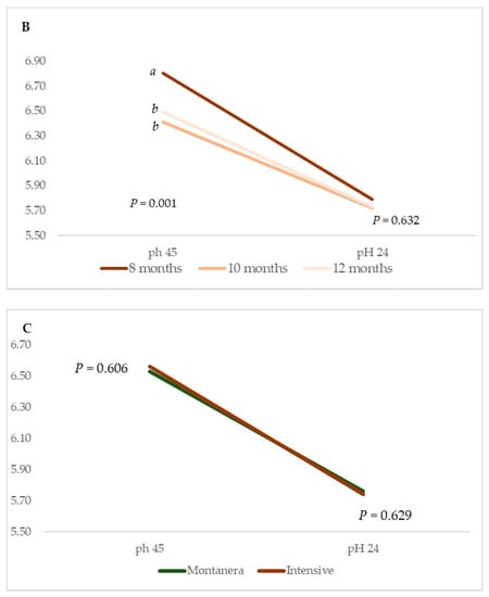 Arithmetic mean pH values measured in m. Longissimus thoracis from Iberian × Duroc crossed animals at 45 min and 24 h after slaughter according to the age at slaughter of the animals in each production system: Montanera at 12, 14 and 16 months (A) and intensive at 8, 10 and 12 months (B) and the production system itself (Montanera vs. Intensive) (C). Different letters indicate differences due to animal slaughter age within each production system for p = 0.05, according to Tukey´s HSD test.