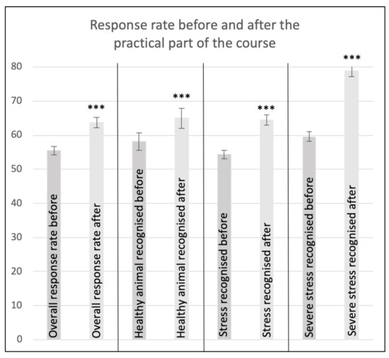 Table 1 shows how many of the questions were answered correctly before and after the course. The overall correct answer rate was 55.54%, while after the practical part of the course, 63.74% of the questions were answered correctly, which corresponds to an increase in performance of 8.2%. Healthy animals were correctly identified in 6.85% of the cases after the course and stressed animals in 10.05%. With regards to recognising that an animal is under severe stress, there was even an increase of 19.17%.
